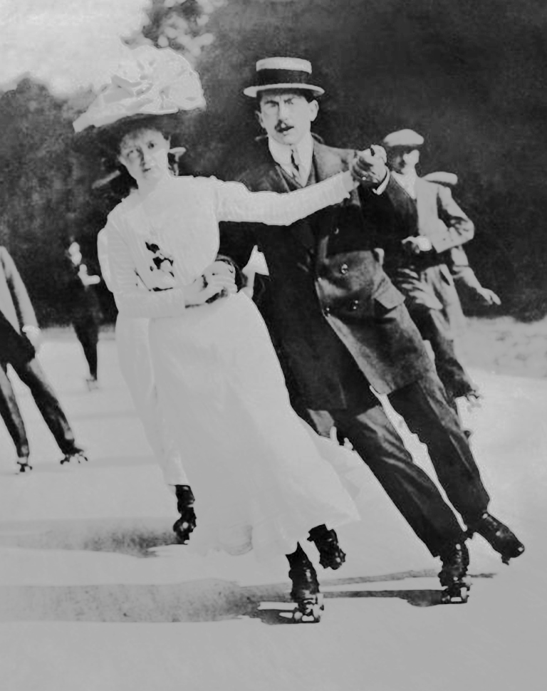 Couple découvrant le patin à roulettes en 1920, intérêt grandissant pour ce sport